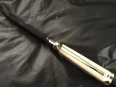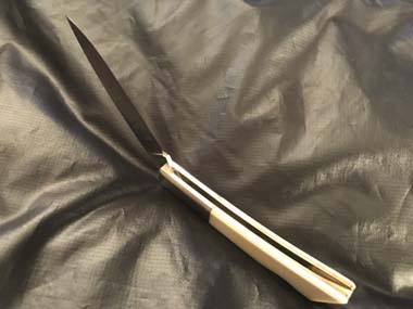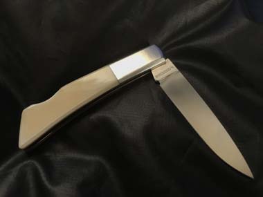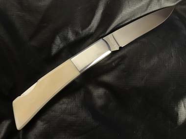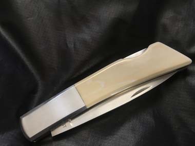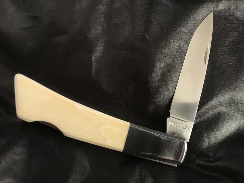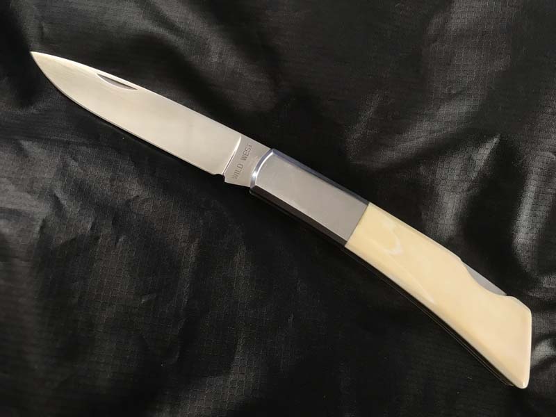 シルバーナイト300A IVORY, WILDWEST モデル 80年代、ガーバーのシルバーナイト・シリーズが最も輝いていた時代のストック品の一点もの。最も大きなサイズのモデル300Aのショウ・スペシャルモデルで、ハンドル材に本象牙ピースを両面共に使用しています。このナイフは一般には販売されず、本来は米国のジュエリーショップ向けに製作したもの。当時、薄い象牙材にひび割れが続出し、数量が上がらずとても困ったのを記憶しています。このアイテムは弊社のナイフのブランドとしていた、WILD WESTのブレードを取り付け、記念品として関係者に頒布したものです。(WILDWESTではなく、WILD WESTとしていたのは相当初期です・・) 鋼材はギンガミ一号、その他の仕様はシルバーナイトと全く同じです。レアと言えるのはこの薄いピースで象牙材にひび割れが無く、綺麗な状態なのは本当に稀です。ブレード、口金はサテン仕上げ、全体的にとても細かいスクラッチ(小傷)が有り、特に口金部分は画像でご確認下さい。当時使用していた側材(刃の収納部分とハンドル材の間に使用している板)は真鍮製で経年の酸化膜が出ており、少し磨きをかけています。