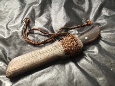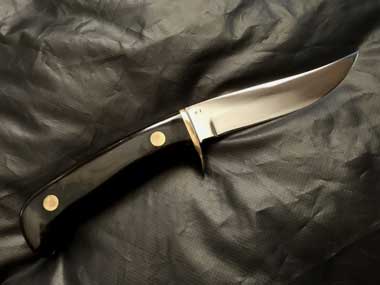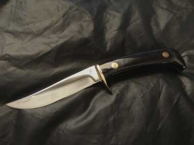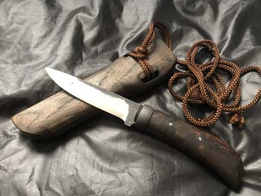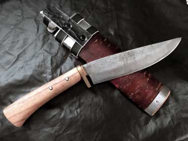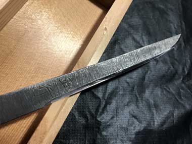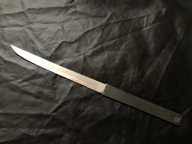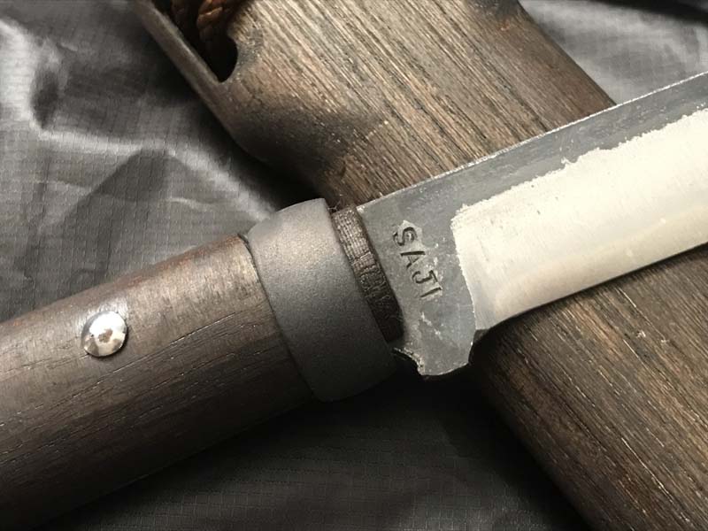 佐治 武士作、ナイフ これは珍しいですね、佐治氏が作ったナイフです。刃物の街、福井県武生のメーカー佐治武士氏は打ち刃物全般を手がける登録伝統工芸士です。佐治氏といえばナタや包丁が有名ですが、これは同じ技法で作られたナイフです。おそらく堺のオールニッポン・ナイフショウに出品されていたものでしょう。11センチのブレードには挟み込み鋼を使用しており、和鋼ならではの切れ味や食い込み、そして砥ぎのし易さは約束されていますね。また、挟み込み鋼の様子が刃先だけでなく背金からもよくわかるのも面白いですね。凝った作りの木製の鞘はヒルトの部分から搾られており、内部で刃が遊びません。何箇所かに小さな錆びがありましたので磨きをかけました。 |