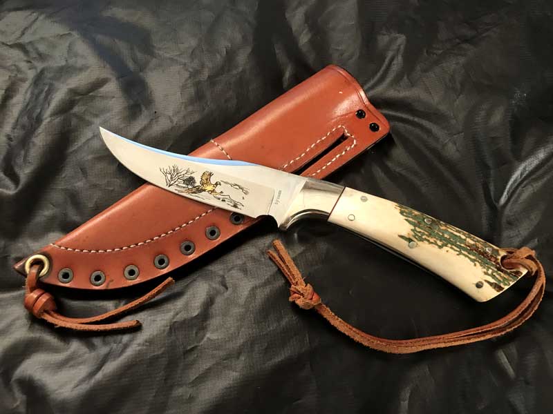 ダム スタッグ フェザント by Dam ダムのナイフ、by Dam の刻印を見て懐かしいと感じる方にお持ちいただきたい、IC CUTさんの製造だと思われるナイフです。反り返らせた半月型のブレード、指架け箇所を設けていたり、ヒモ穴に長めのレザーをタップリ使っているところなどはハンティング志向がはっきりと見られますね。ハンドルには厚みのあるスタッグを贅沢に使用しており、ブレードには雉(フェザント)の図柄がゴールドで描かれています。これはアメリカ人の好みでしょう。ヒルトには高価なニッケルシルバーを使用してします。見かけよりしっかりと重みがあり、厚めのブレード厚ながら切っ先を細かく動かしやすくする意図が見られます。細部まで丁寧に作られており、メーカーの高い技術が伝わってくるモデルです。