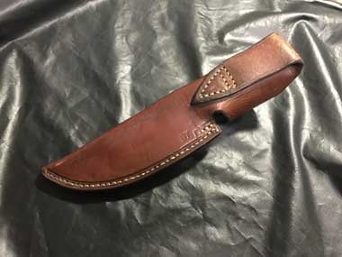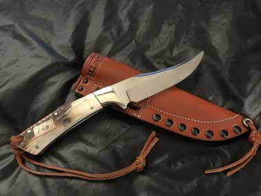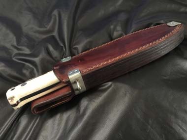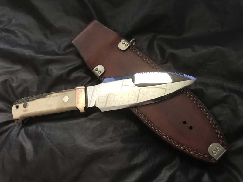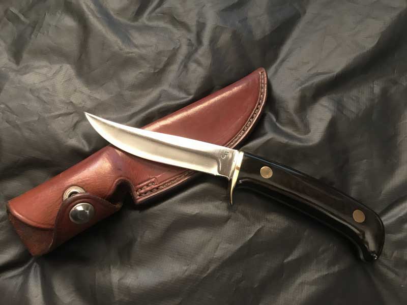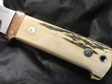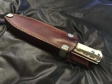 JF ハンター カスタム serial #87 米国の ジョー・ファンダーバーグというロサンゼルスのナイフ・メーカーの作品です。彼についてはあまり情報がなく、当初はフィッシャーの作品だとして紹介しておりましたが、お客様から当方の間違いを教えていただき訂正いたします。 (今後もそういったご指摘を歓迎いたします) この時期、この作品の様子からして恐らく154CM鋼を使用していると思われます。とても美しい流線美は獣が身構えたような獰猛なラインとなっており、見とれてしまうデザインです。タップリと身を持たせたブレード、ワンオフさが見事な造形のヒルトからそのままハンドルへと流れています。また、ハンドルエンド(尻部)には実用性を支えるタップリとした膨らみをもたせてあり、あくまでも実用ナイフであることを譲りませんね。シースの拵えに関して、ステッチの糸がシースの厚みよりも内側を通るように工夫されており、コスレなどによる糸切れや劣化を減らす実用的な工夫も称えるべきでしょう。
