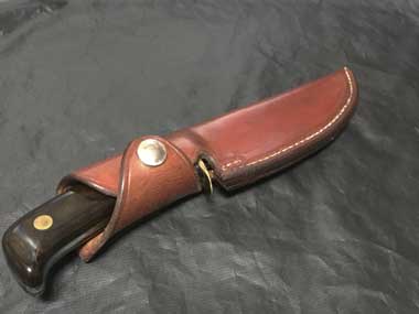 ブレードの部分にはほんの少しスクラッチ、小傷が見て取れ、。またシースの内側やハトメの部分には緑青が吹いていた様子が見て取れます。シースにもキズや当たり痕があります。ホック(ボタン)の動作には問題がありません。全体的に深刻な錆びや傷跡はみあたりません。リネンマイカルタのハンドルに劣化は見られず、絶妙な形状はしっとりと手に馴染み、エンドの部分の形状の工夫が安心感をくれます。実重量より軽く感じるのはバランスの良さのなせる業でしょう。シースは年月を重ねて光沢を得て、良い色、良い感触になっていますね。
