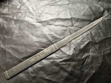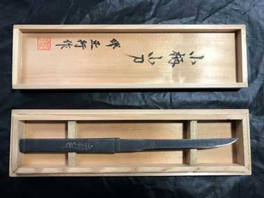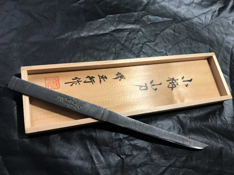 池田 正行作 小柄小刀 四寸 池田氏は和田榮氏とは北辰一刀流の居合い道場で最初に出会いました。刃物の町堺の打ち刃物鍛治であった池田氏は卍正行の名で知られる刀匠であり、後に伝統工芸士となります。多くのメーカーが氏の打った刃材を使い、カスタムナイフとして販売をしていました。抜群の信頼性とすぐれた切れ味、そして美しい仕事でした。当方でも氏の刃材を使用した挟み込み鋼やダマスカス鋼を使用したカスタムナイフを販売したことがあり、他にも当方のブランド、WILDWESTの刻印をした釼型の鉈「シカリ」も長年に渡り販売していました。当時ビーパルの広告にシカリを載せたところ、大変好評で常時売り切れていました。 魂のこもった刃物は魔物除けとして大きな力を持つ。嫁に出る娘に懐剣を持たせる風習があった時代から言われていることです。今で言われるパワースポット、以前はパワーストーンを身につけることと同様なのかもしれません。堺の刀匠、正行が火造りし、魂を込めて打った小刀は大変貴重なパワーアイテムです。