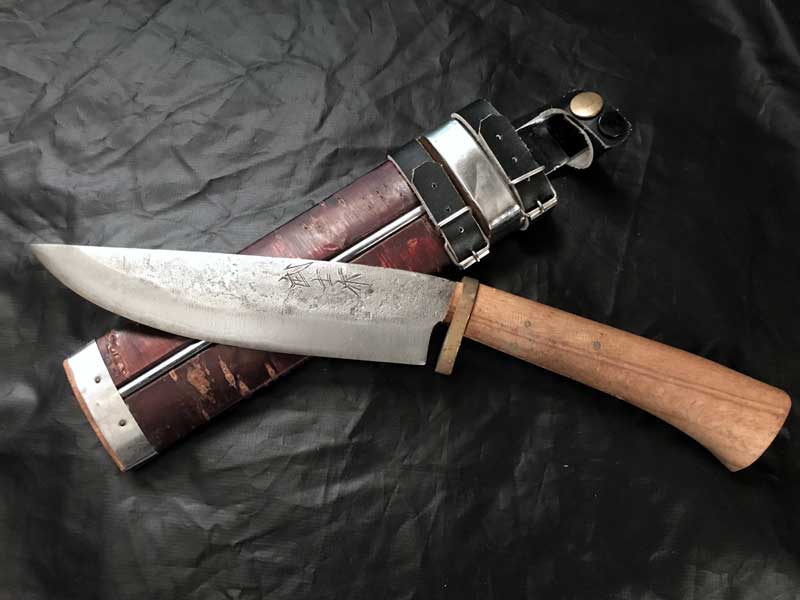 佐治武士 作 釼ナタ 刃物の街、福井県武生のナイフメーカーである佐治氏は、ナイフだけではなく包丁や打ち刃物全般、包丁なども手がける登録伝統工芸士です。この作品は狩猟を趣味とする和田榮氏が個人用に政策を依頼した釼ナタで、全体のシルエットが「く」の字に曲がっている、いわゆるブーメラン型になっています。これは藪コキなどの時、動く枝などを払う場合に有効な設計です。刃元厚が6ミリをこえる重量感タップリのハードギアですが、木製鞘には桜の皮が巻かれるなど、贅沢な使用となっています。また、釼(ケン)型は野良での仕事全般に頼もしく、長く付き合える一本です。 刃の背の部分などには僅かに錆びが見て取れます。また、鞘に使われている人工レザーはひび割れており、その他も経年痕、使用痕があります。