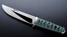 ROCKSTEAD の最高級モデルです。刃形は本作り、日本刀を彷彿させる強靭で鋭い切れ味のナイフです。凝りに凝った柄巻き(ハンドル)は日本刀と変わらぬ本格的な造りです。鞘にはロック機能を持たせ、ウッドマイカルタとレザーを使用しています。運はROCKSTEADの技術の粋を結集した作品です。